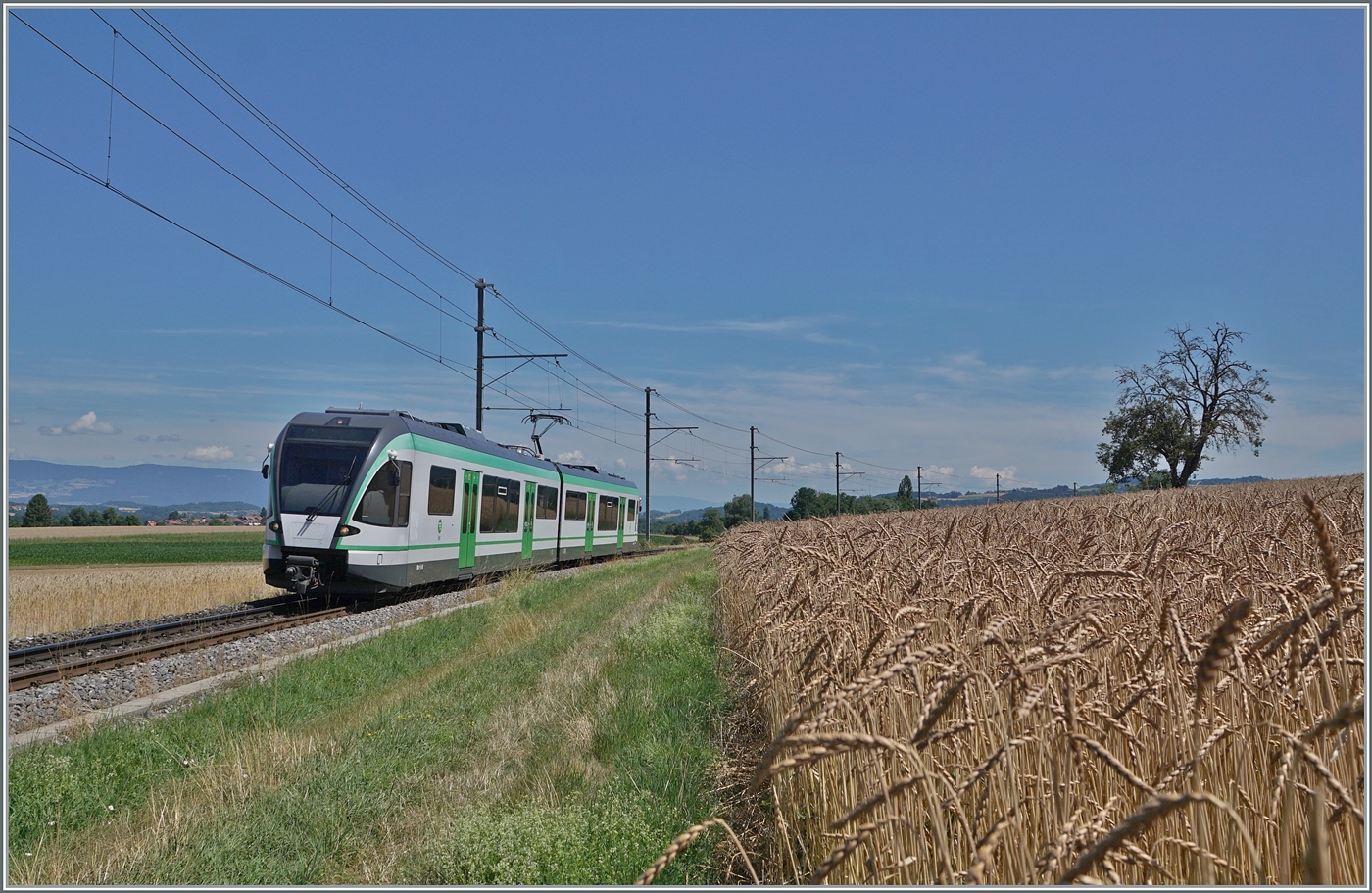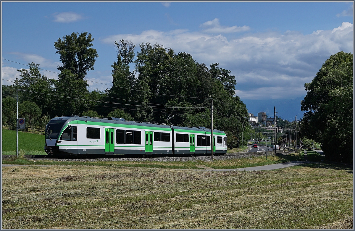Der RBe 4/8 49 und LEB Be 4/8 35 "Romanel" verlassen die Station Jouxtens-Mézery.