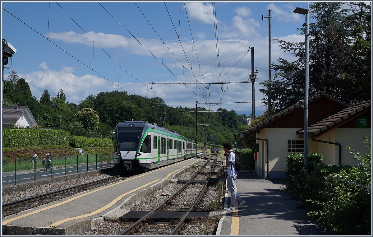 Der LEB RBe 4/8 N° 48 ist als R20 zwischen Bercher und Fey auf dem Weg nach Cheseaux mit Anschluss nach Lausanne per SEV infolge Sommerbauarbeiten. Die 24 km langen Strecke der LEB beginnt in der "Grossstadt" Lausanne und endet im ländlichen, wenig dicht besiedelten Bercher im Gros-de-Vaud, der Kornkammer des Kanton Waadts.