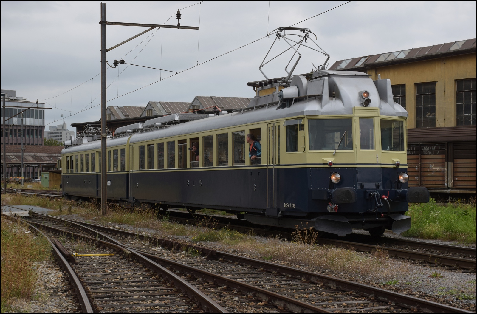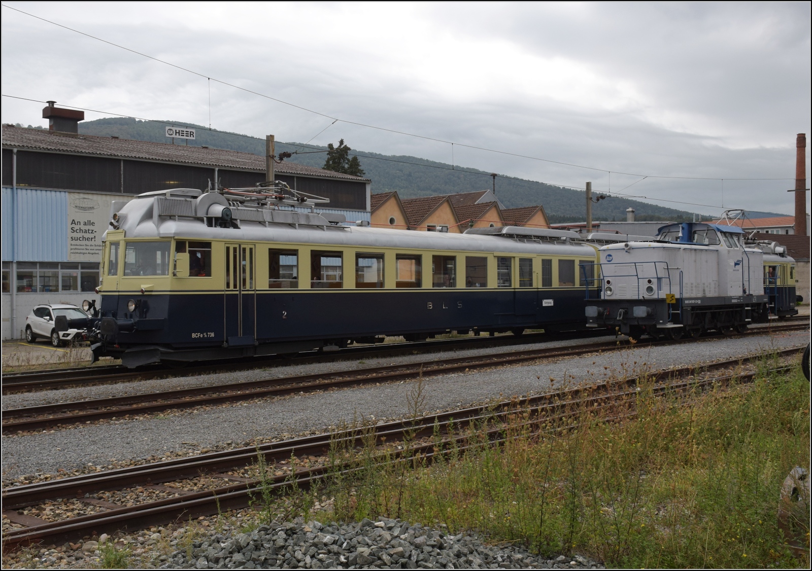 Der BCFZe 4/6 der BLS im funktionellen Design ist einer der Stars der Ausstellung. Er wurde im Jahr 1938 noch vor der Fusion an die Bern-Neuenburg-Bahn geliefert. August 2023.