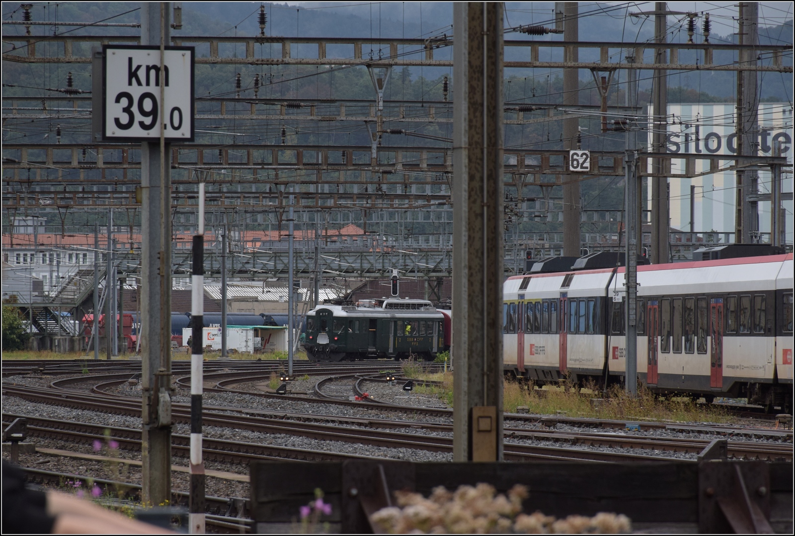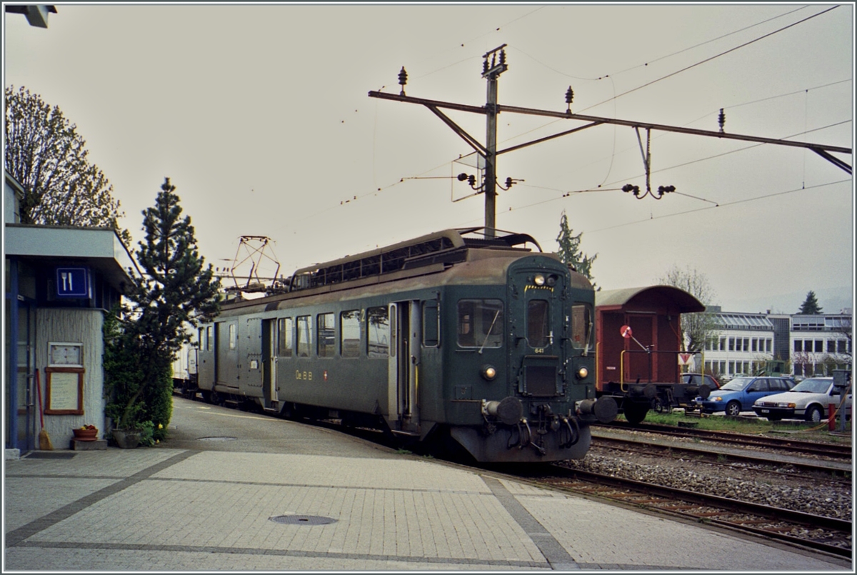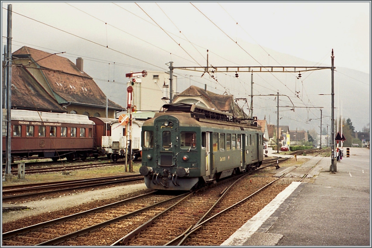 Der Verkehr auf der Strecke Herzogenbuchsee - Lyss wurde meist mit BDe 4/4 Treibwagen-Pendelzügen (bestehend aus B und Bt (deklasiertem ABt)) abgewickelt. Ein solch typischer Zug zeigt sich hier bei der Einfahrt in Büren an der Aare.