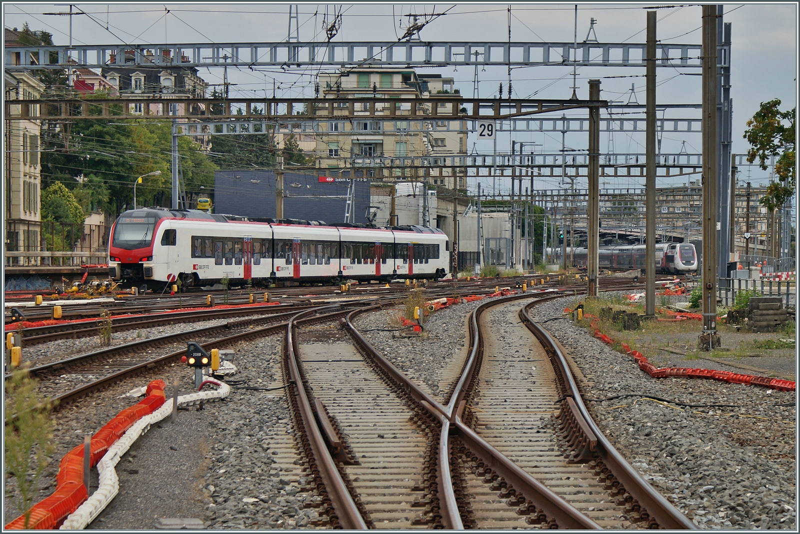 Während ein Fernverkehrs RABe 523 (Mouette) als Regionalzug nach Palézieux den Bahnhof von Lausanne verlässt, steht im Hintergrund der TGV Lyria Rame 4718, um bereitgestellt zu werden.