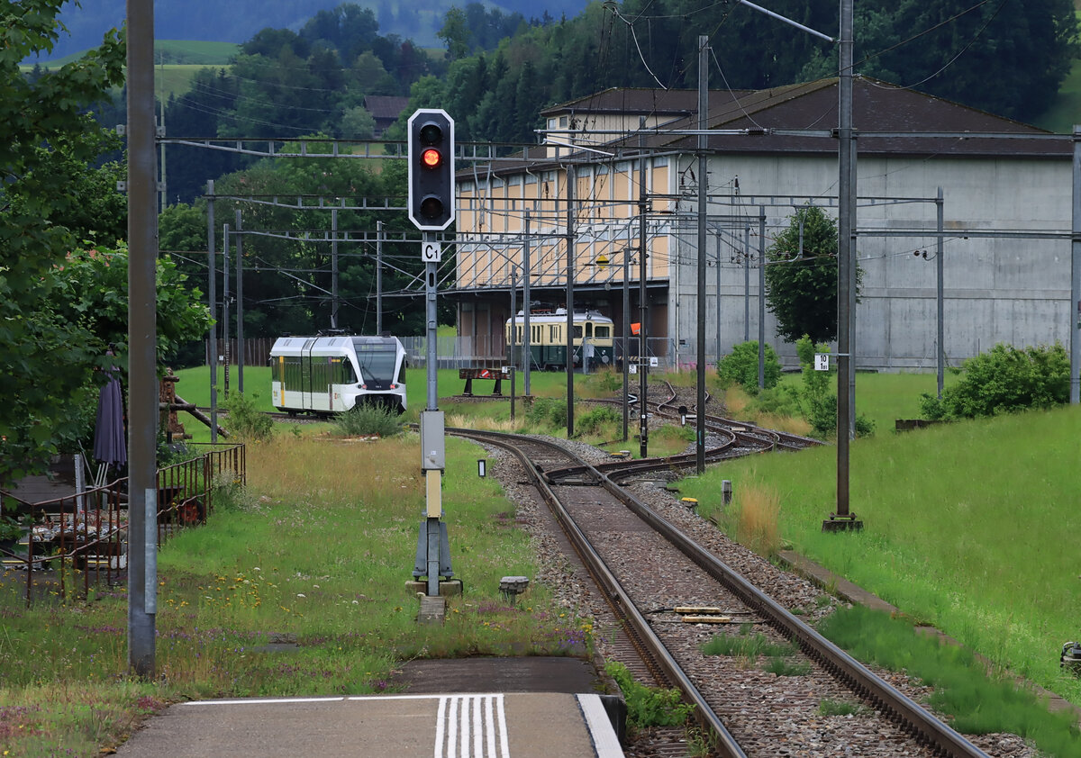 Die St.Galler S-Bahn Linie S9 (Wil - Wattwil): Bei der Ausfahrt aus Lütisburg fährt GTW 2/6 726 am restaurierten Sensetalbahn Triebwagen 101 vorbei. 9.Juli 2021