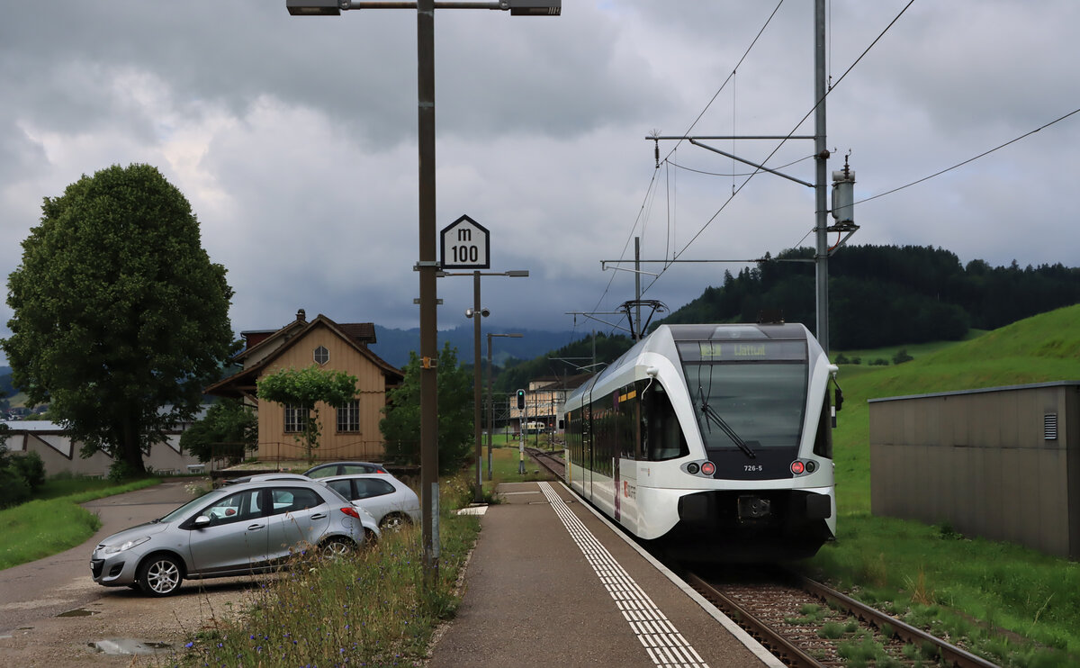 Die St.Galler S-Bahn Linie S9 (Wil - Wattwil): Der GTW 2/6 726 der THURBO in der Haltestelle Lütisburg. Ganz weit hinten ist der Sensetalbahn-Triebwagen 101 zu sehen. 9.Juli 2021