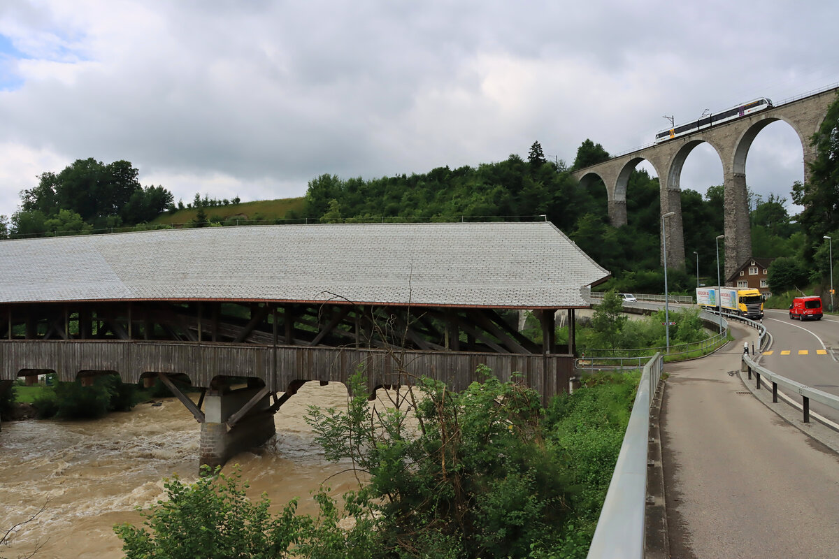 Die St.Galler S-Bahn Linie S9 (Wil - Wattwil): THURBO GTW 2/6 726 kommt auf der Fahrt von Wattwil nach Wil über die Gonzenbachbrücke bei Lütisburg. 9.Juli 2021 (Wegen dichtem Gebüsch konnte ich das Bild nicht von weiter hinten aufnehmen, um die ganze Holzbrücke draufzubekommen)