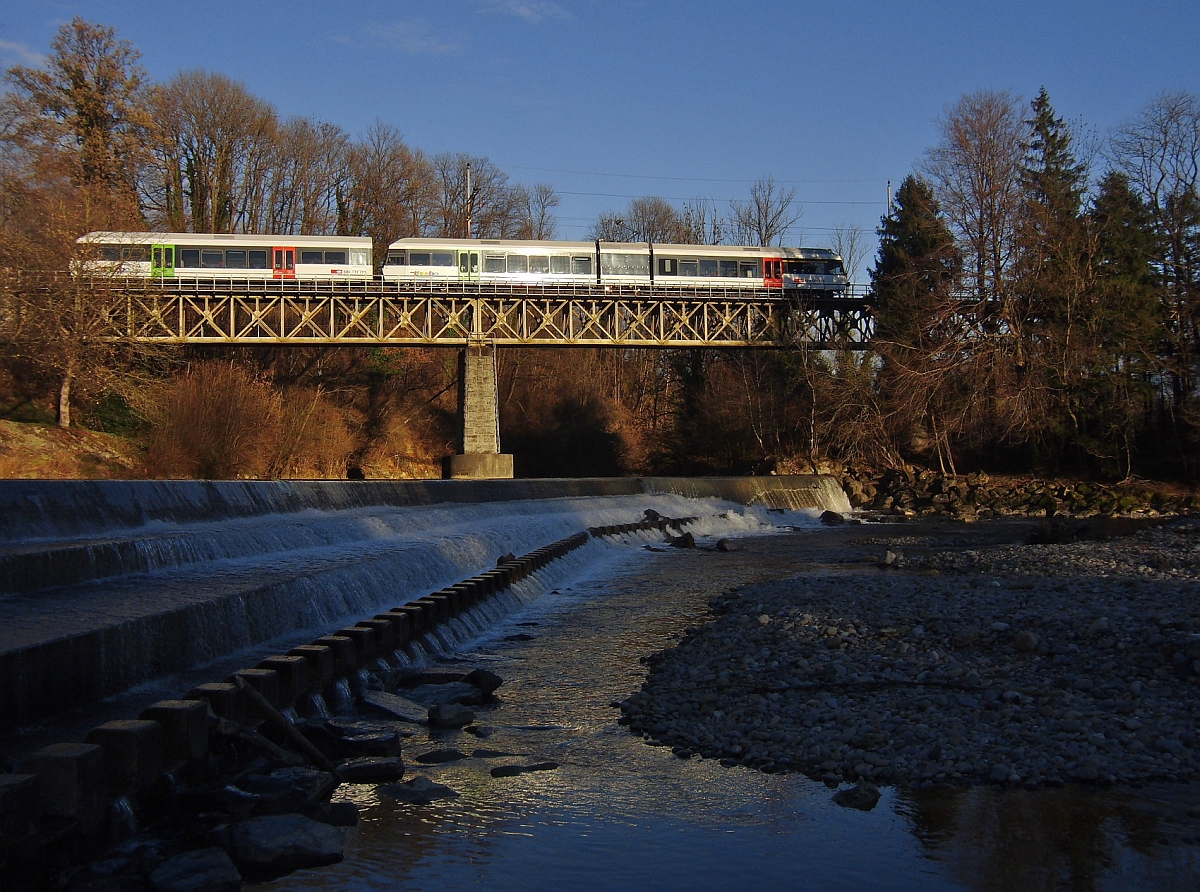 Ein GTW der ersten Generation überquert am 07.12.2013 als S5 23564 von St. Gallen nach Weinfelden die Sitter und befindet sich kurz vor dem Halt in Sitterdorf. Jürgen Vos
