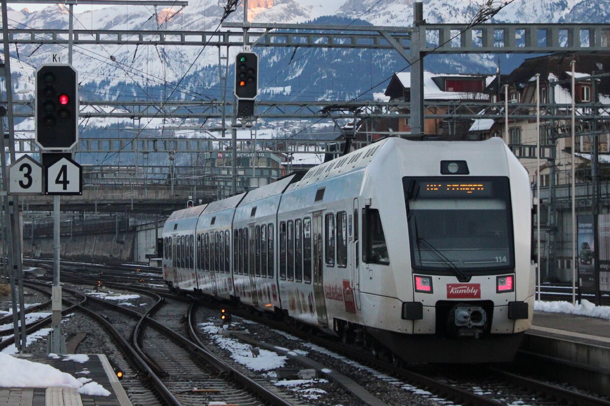 Auf der Pionierstrecke für Elektrobetrieb, der Burgdorf-Thun-Bahn ist nunmehr mit RABe 535 104 ein Lötschberger unterwegs. Konolfingen/Eymatt, Juni 2023.