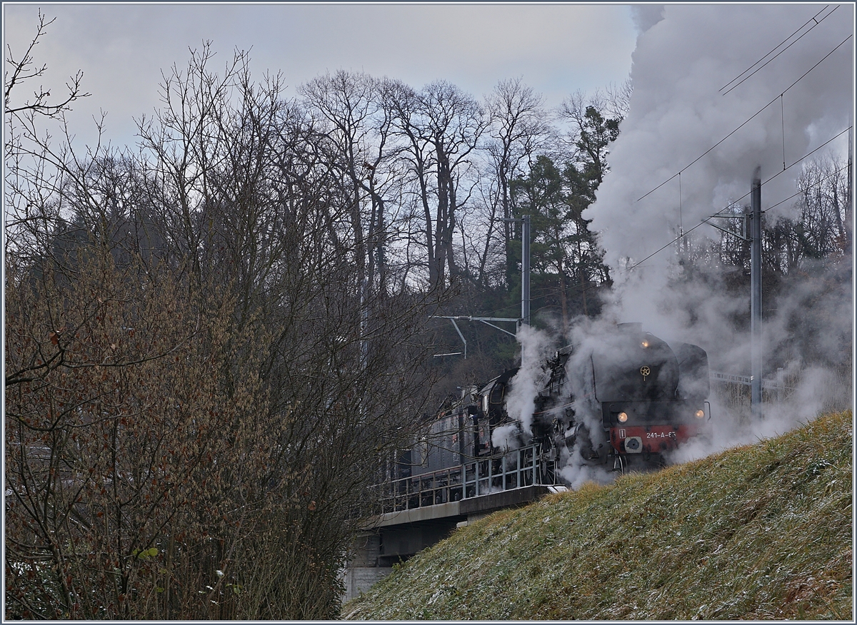Von Dampf und Rauch sowie der Vegetation etwas verdeckt erreicht die SNCF 241-A-65 Koblenz. 9. Dez. 2017