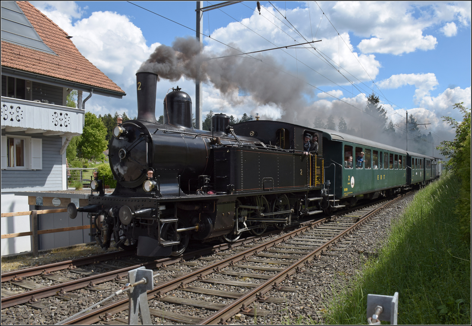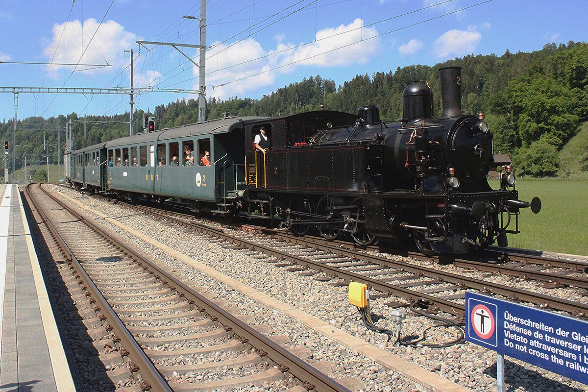 Ein Zug der VHE (Verein Historische Eisenbahn Emmental) mit Lok Ed 3/4 2 hat Wasen im Emmental erreicht. Ich bin recht optimistisch für die Zukunft dieser Strecke, denn neben schönen Wirtshäusern und dem guten Emmentaler Käse starten in Wasen auch prachtvolle Rundfahrten mit alten Postautos; ausserdem ist das atemberaubende Panorama der Lüderenalp nicht weit. 9.Mai 2021